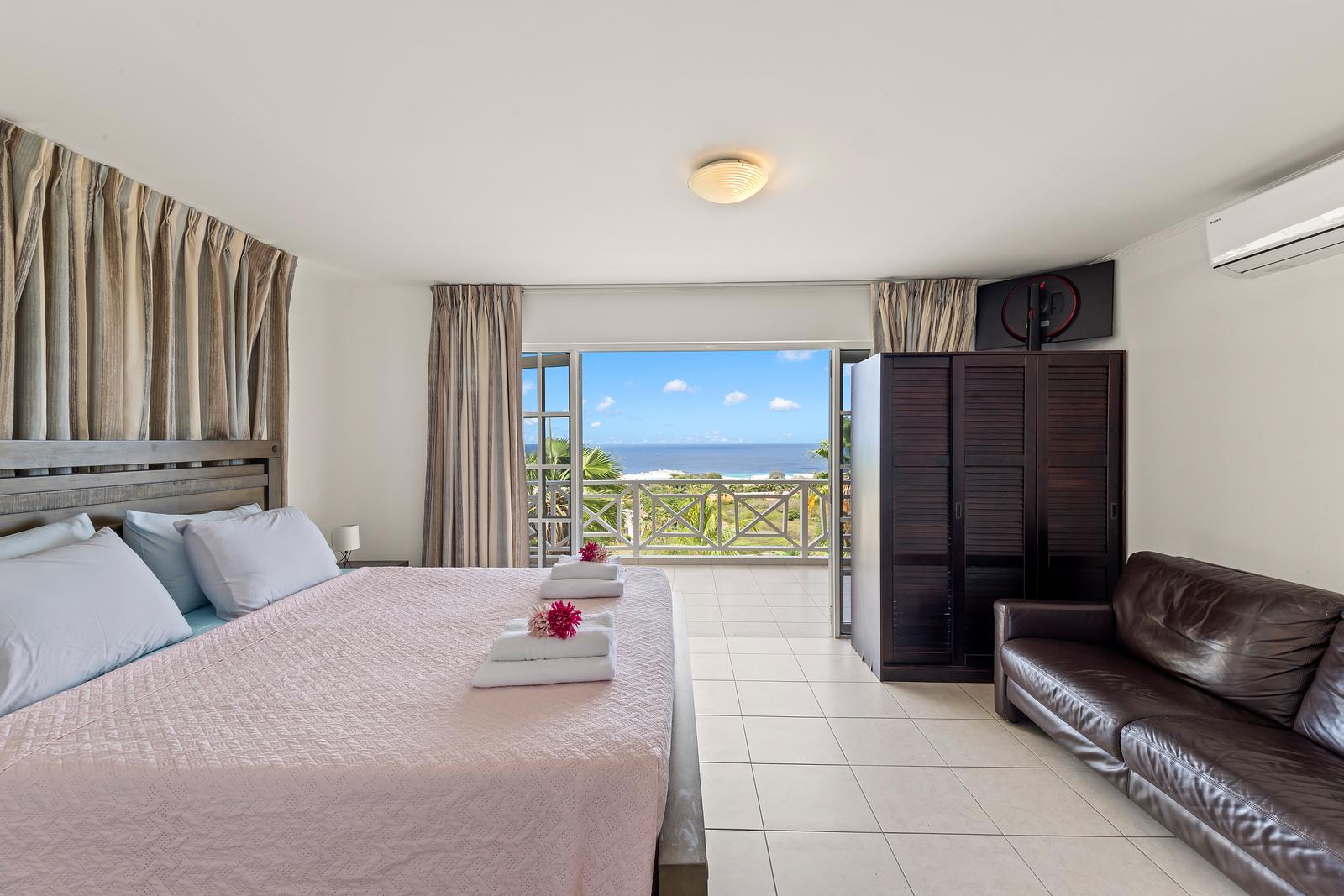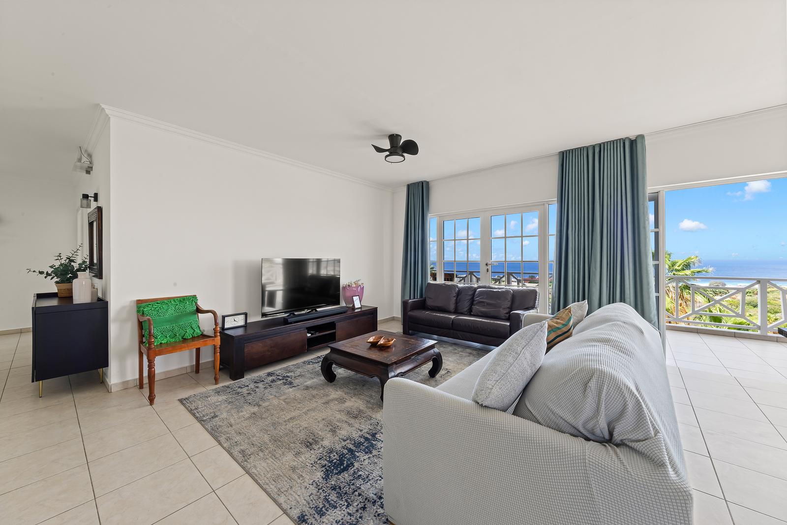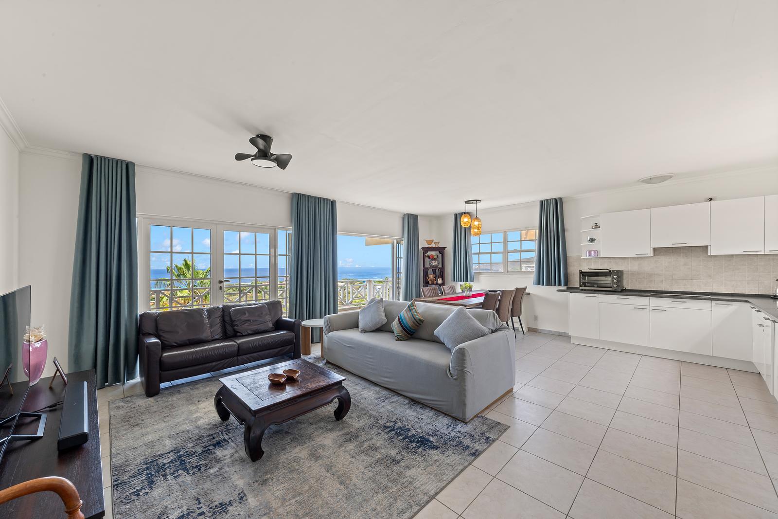 Zodra je binnenstapt, word je omringd door licht en ruimte. De woonkamer heeft grote openslaande deuren met uitzicht over de helderblauwe zee. Op het ruime balkon kun je urenlang genieten van het spectaculaire 180° uitzicht: ‘s ochtends met een kop koffie in de zachte bries, en ‘s avonds terwijl de zon langzaam achter de horizon verdwijnt.