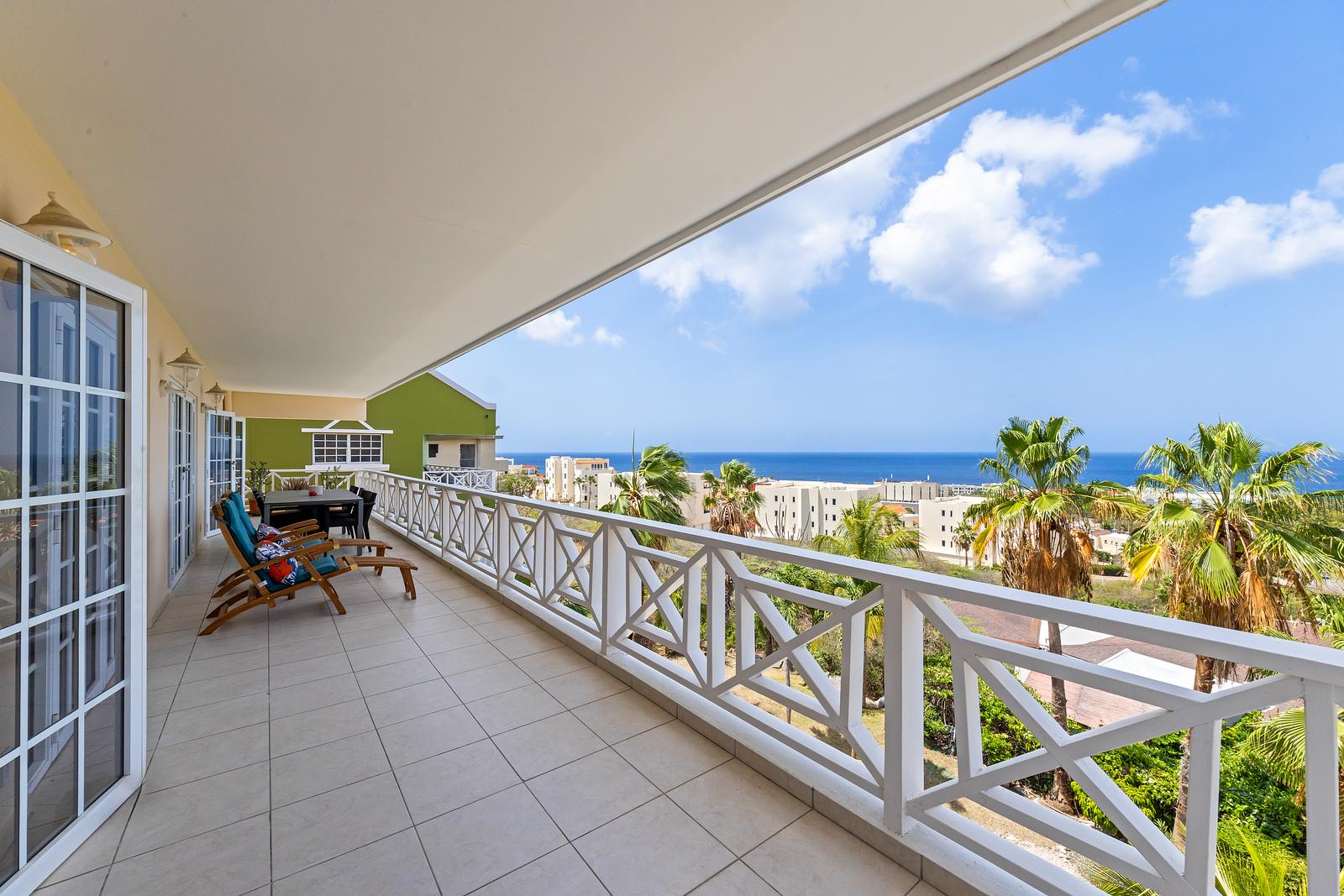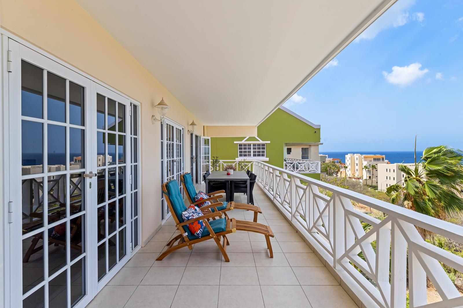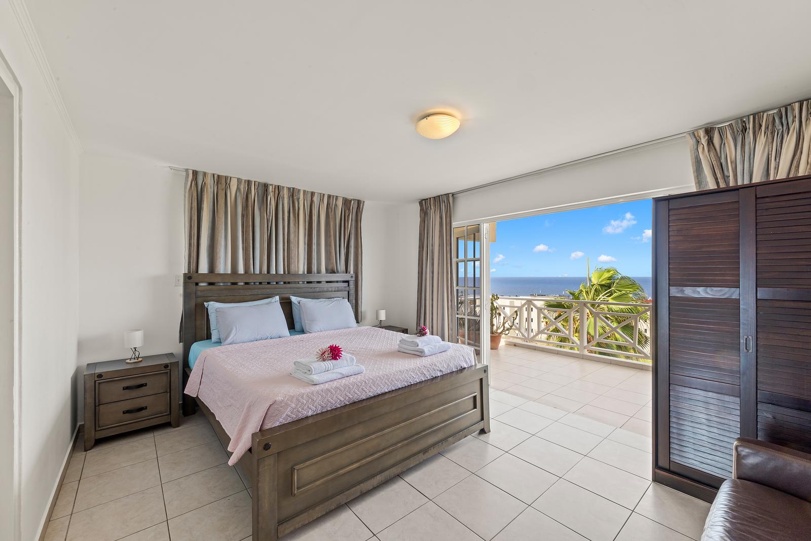 Zodra je binnenstapt, word je omringd door licht en ruimte. De woonkamer heeft grote openslaande deuren met uitzicht over de helderblauwe zee. Op het ruime balkon kun je urenlang genieten van het spectaculaire 180° uitzicht: ‘s ochtends met een kop koffie in de zachte bries, en ‘s avonds terwijl de zon langzaam achter de horizon verdwijnt.