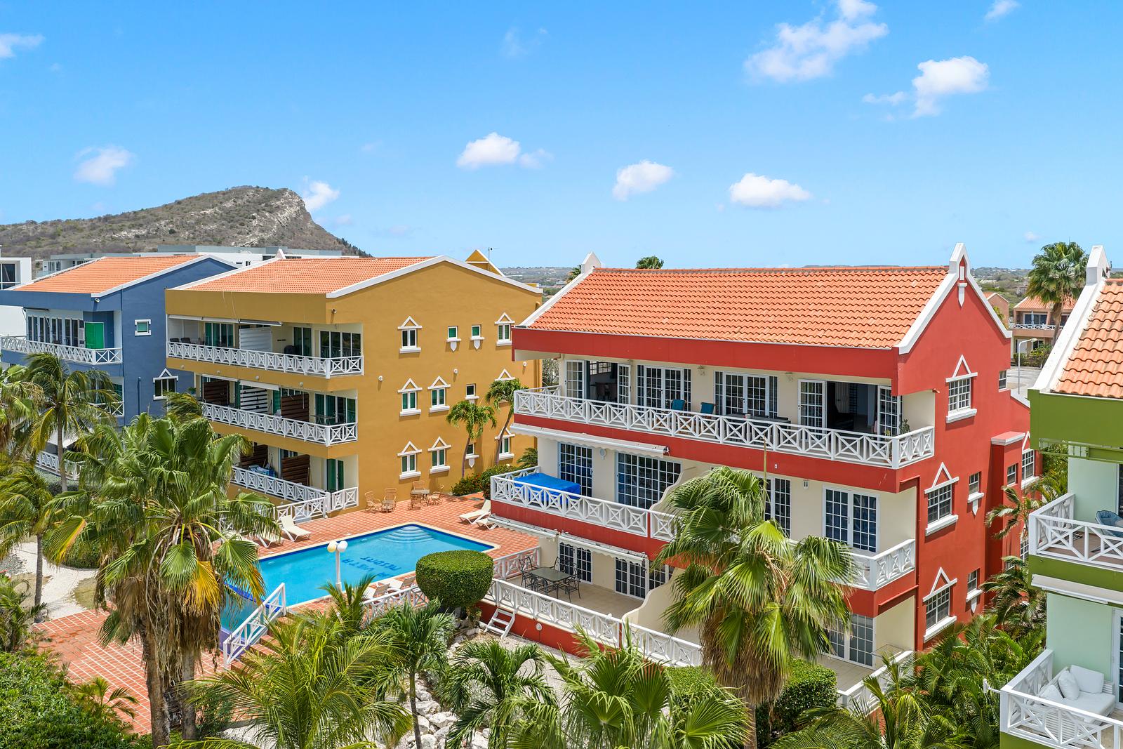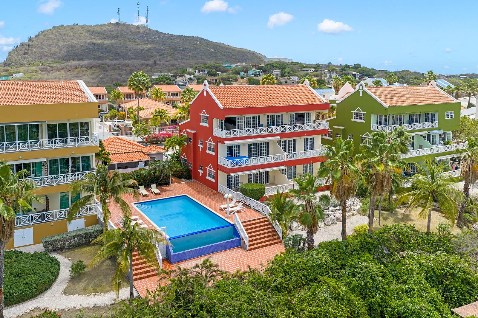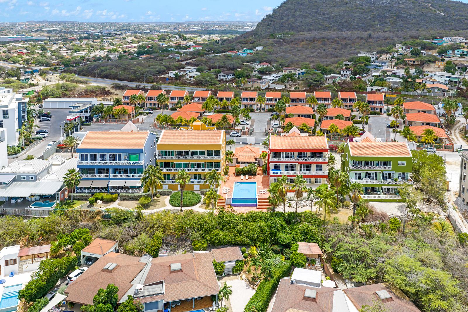 Het resort zelf is afgesloten en veilig, met voldoende parkeergelegenheid binnen het hek. Binnen enkele minuten rijd je naar het centrum van Willemstad, terwijl de mooiste stranden van het eiland ook binnen handbereik liggen.