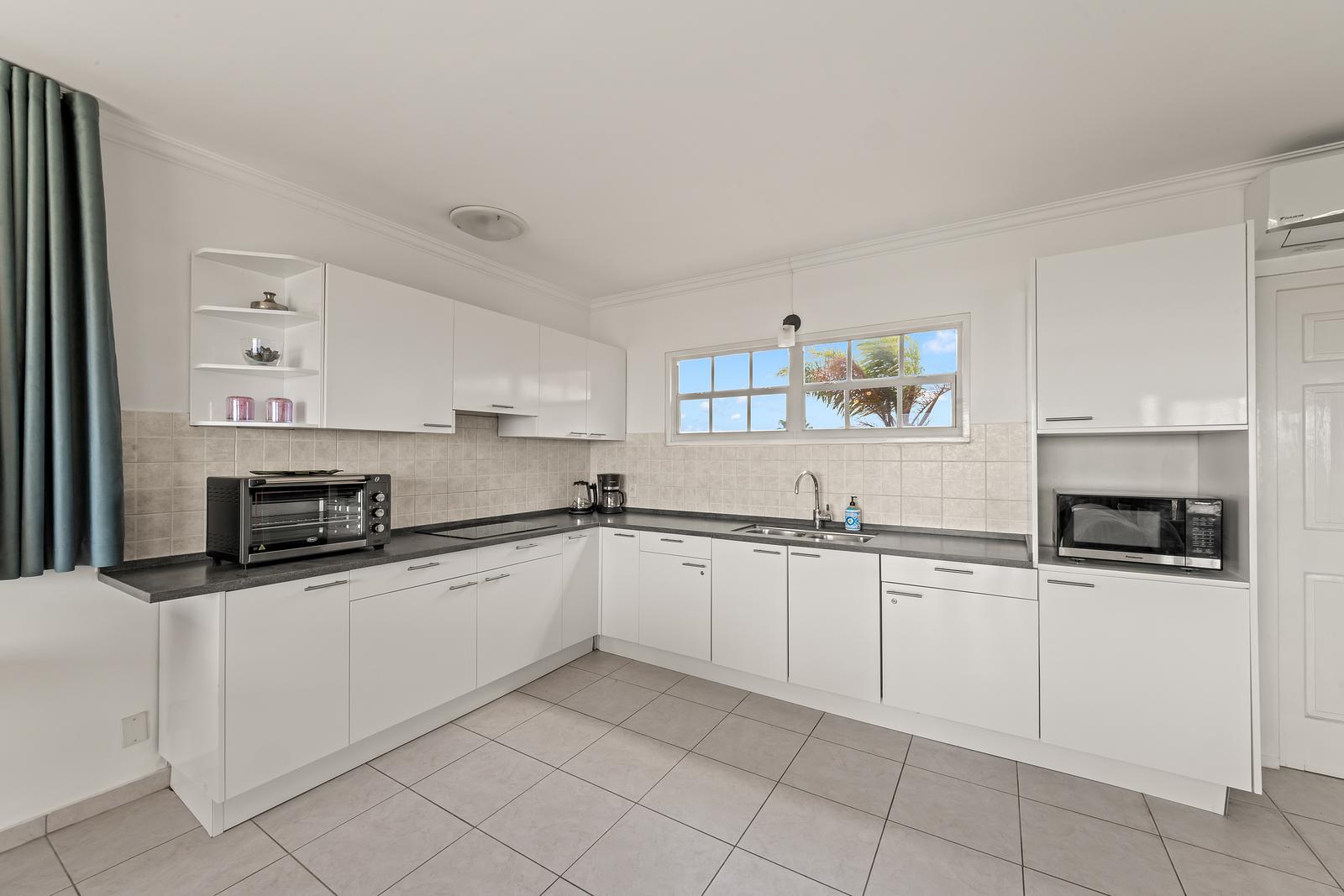 De keuken is volledig uitgerust met alles wat je nodig hebt om een lekkere maaltijd te bereiden, maar met Pirate Bay Beach, de visserij en verschillende gezellige restaurants op een aantal minuten afstand, is uit eten gaan minstens zo verleidelijk. Ook vind je binnen het resort een prachtig gedeeld zwembad met uitzicht op zee en een zonnig terras, perfect voor een ontspannen middag of een frisse duik.